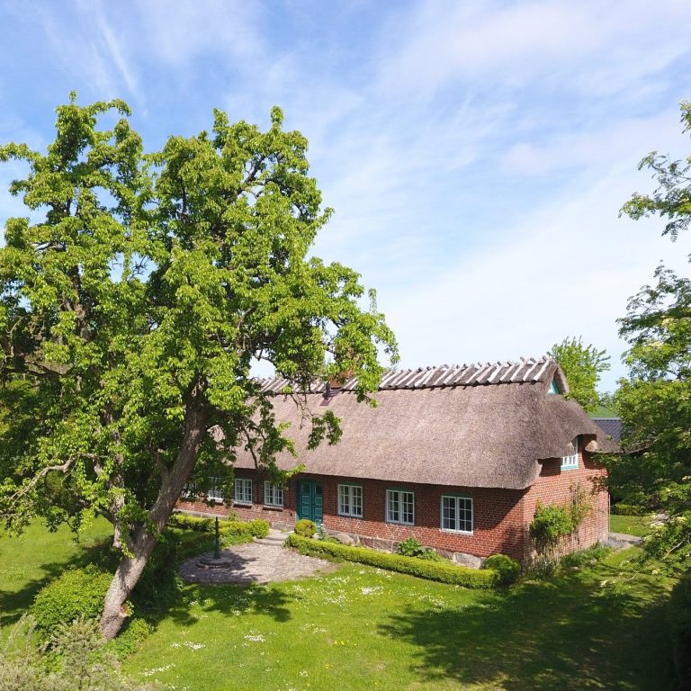 125qm I bis 6 Personen I Hunde willkommen I Idyllisch gelegene Reetdachkate auf weitläufigem Hofgelände umgeben von alten Bäumen und weiten Wiesen. Mit Spielhaus, Feuerstelle, Kamin und viel Platz!